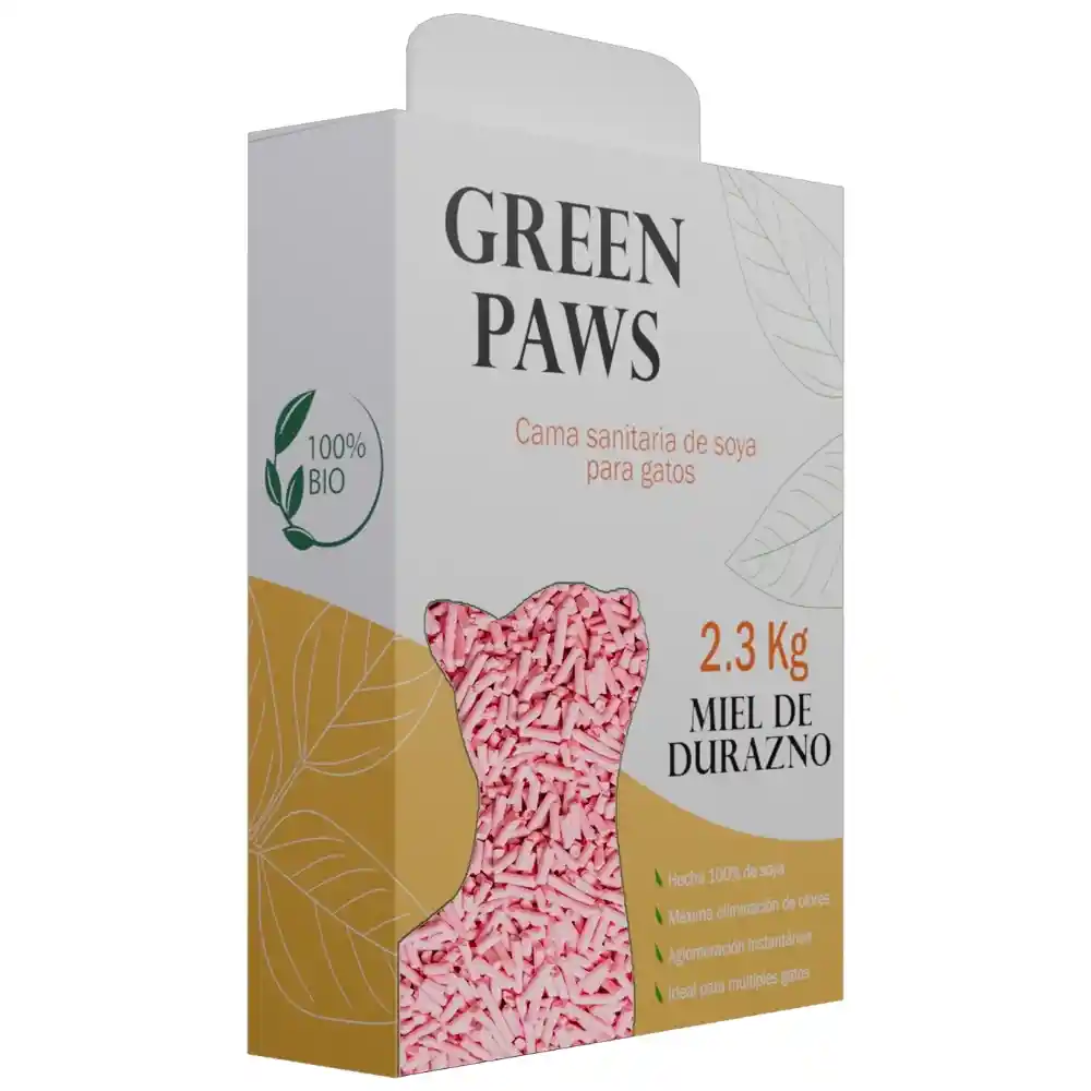 Cama sanitaria para gatos Green Paws es un producto 100% natural, compuesto por el desecho que produce la soya, ese desecho se le ha dado nueva vida útil como arena para gato biodegradable que absorbe la orina y los desechos fecales del gato.