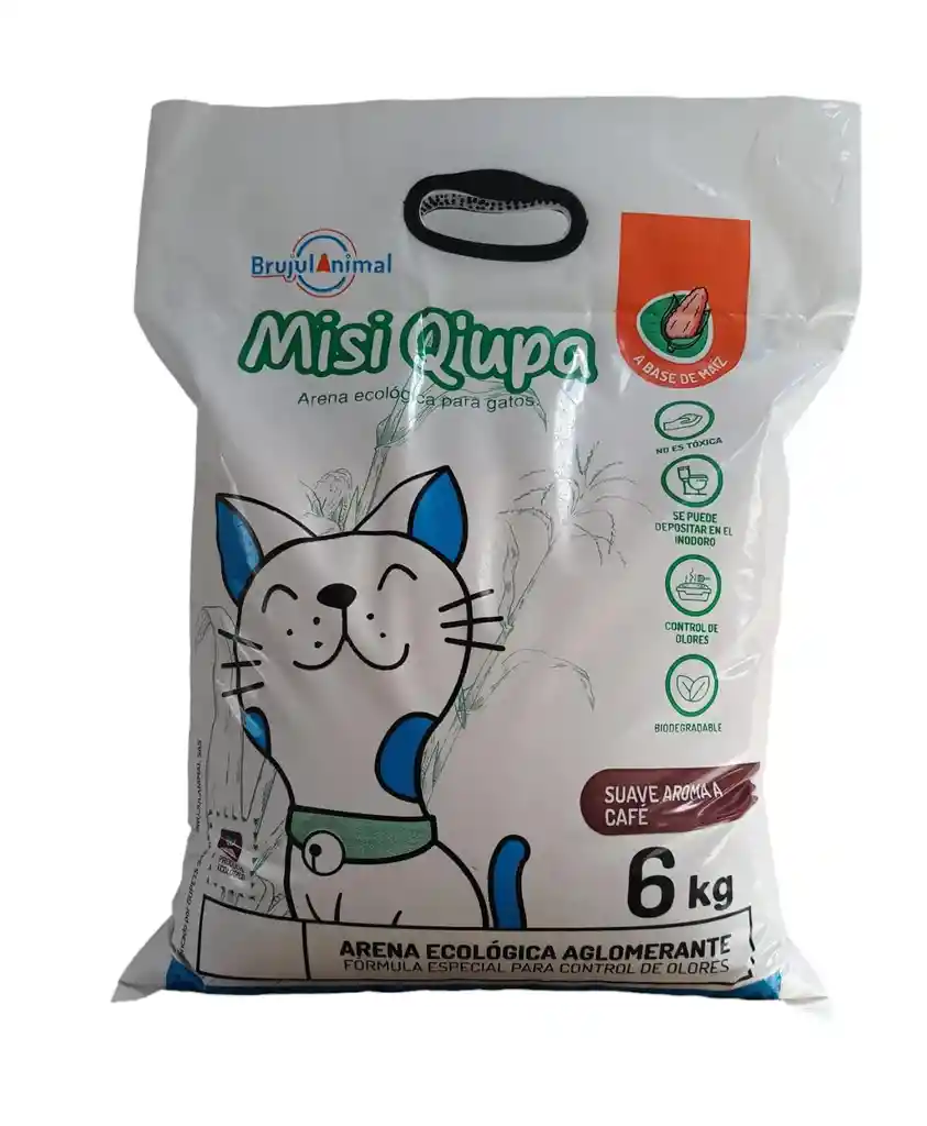 Arena ecologica Misi Q'upa consiste en la mezcla de harina de maíz con una formula especial para aromatizar nuestro producto disminuyendo los olores y mejorando su aglomeración. Su innovadora composición hace que nuestra arena sea hipoalergenica, libre de polvo, no toxica y biodegradable Misi Q´upa de 6 Kg 1 Gato 60 – 70 Días 2 Gatos 30 -35 Días PRESENTACION: Bolsa 6 kg