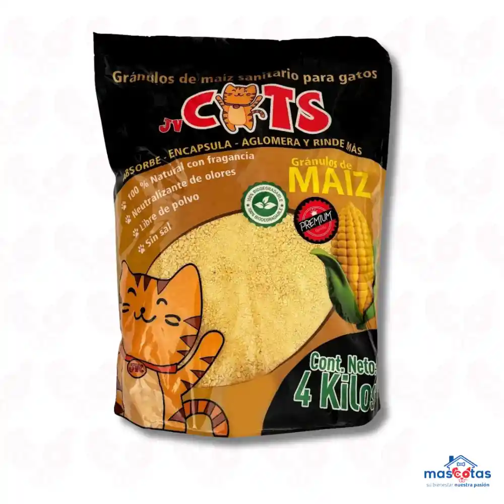 La Arena JV CATS GRANOS DE MAIZ es una arena sanitaria ecológica, biodegradable, y fabricada 100% de maíz que absorbe la humedad y elimina los olores de la orina y las heces. Forma terrones aglomerantes de fácil limpieza, es libre de polvo y puede desecharse por el inodoro, lo que la hace amigable con el medio ambiente y cómoda para los dueños de gatos. Características principales: Material: 100% Maíz. Aglomerante: Forma terrones completos y sólidos al contacto con la orina y heces. Control de olores: Neutraliza eficazmente los malos olores, manteniendo un ambiente fresco. Ecológica y biodegradable: Su composición natural la hace segura para el medio ambiente y permite desecharla en el sanitario sin riesgo de obstrucción de tuberías. Libre de polvo: Protege la salud respiratoria de los gatos y de los humanos. Alta absorción: Mantiene la bandeja seca y limpia por más tiempo. Instrucciones de uso: Añade una capa de arena de maíz a la bandeja sanitaria hasta alcanzar unos 4 cm de altura. Retira diariamente las aglomeraciones de heces y orina. Puedes desechar los desechos en el sanitario, esperando 5 a 10 minutos antes de bajar el agua para evitar taponar las tuberías.