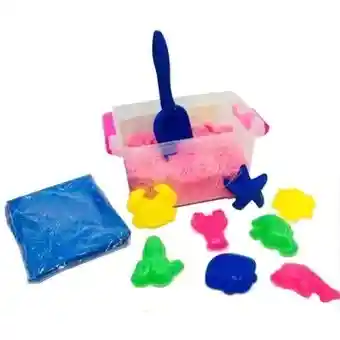 KIT ARENA CINÉTICA 1000 gr + PISCINA + MOLDES La arena cinética ofrece una textura con características propias y peculiares que supone un estímulo sensorial muy agradable y que encanta a los niños. Para limpiarla solo es pasarla por un colador, ya que puede suceder que los niños dejen otros juguetes en ella. Es más sencillo moldear con ella que con arena húmeda. * La arena mágica es inodora, limpia al tacto y no mancha la piel ni la ropa, características muy favorables en un juguete. * No toxica. * Si se humedece demasiado, solo extiéndela al aire libre. * Si por el contrario se seca mucho solo agrégale un par de gotas con gotero, revuelve y listo!! Te entregamos: - 1000 gramos de arena mágica. - 6 Moldes plásticos. - inflable para verter la arena. - 1 pala. - Colores: amarilla,verde,naranja,morada,fucsia: se envía de acuerdo disponibilidad de color de cada variante