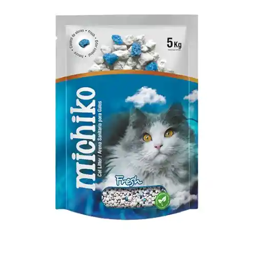 Arena Sanitaria Michiko Fresh Neutraliza y absorbe rápidamente los olores de las heces y la orina de los gatos. Contiene bentonita blanca y excipiente C.S.P. (fresh scent), que proporciona un rendimiento incomparable para el control de olores. Las partículas de tamaño compacto dan como resultado un muy buen rendimiento de aglutinación con grumos redondos bien formados. Tiene una muy buena capacidad de absorción de líquidos y es un 99.5% libre de polvo.