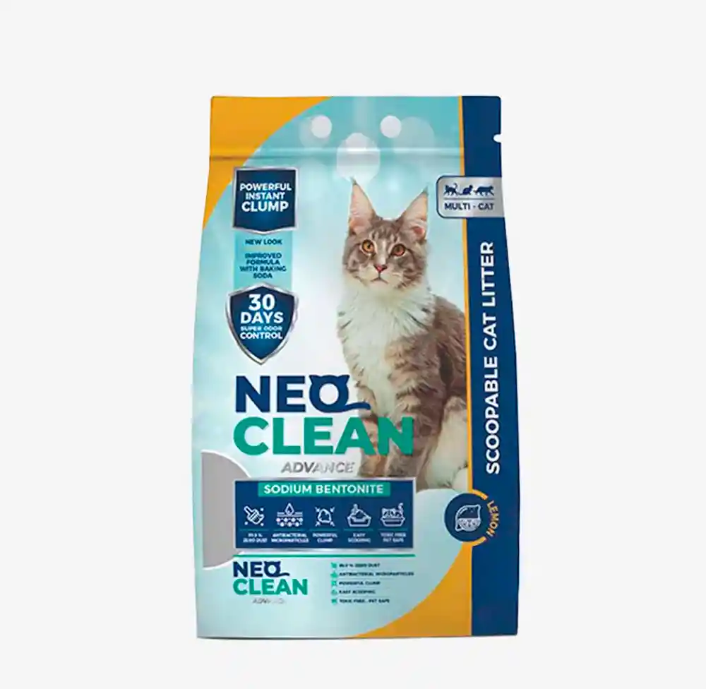 La arena Neo Clean con aroma a Limón para gatos, tiene una fórmula hecha a base de Bensonita de sodio con una deliciosa fragancia a limón que ayuda