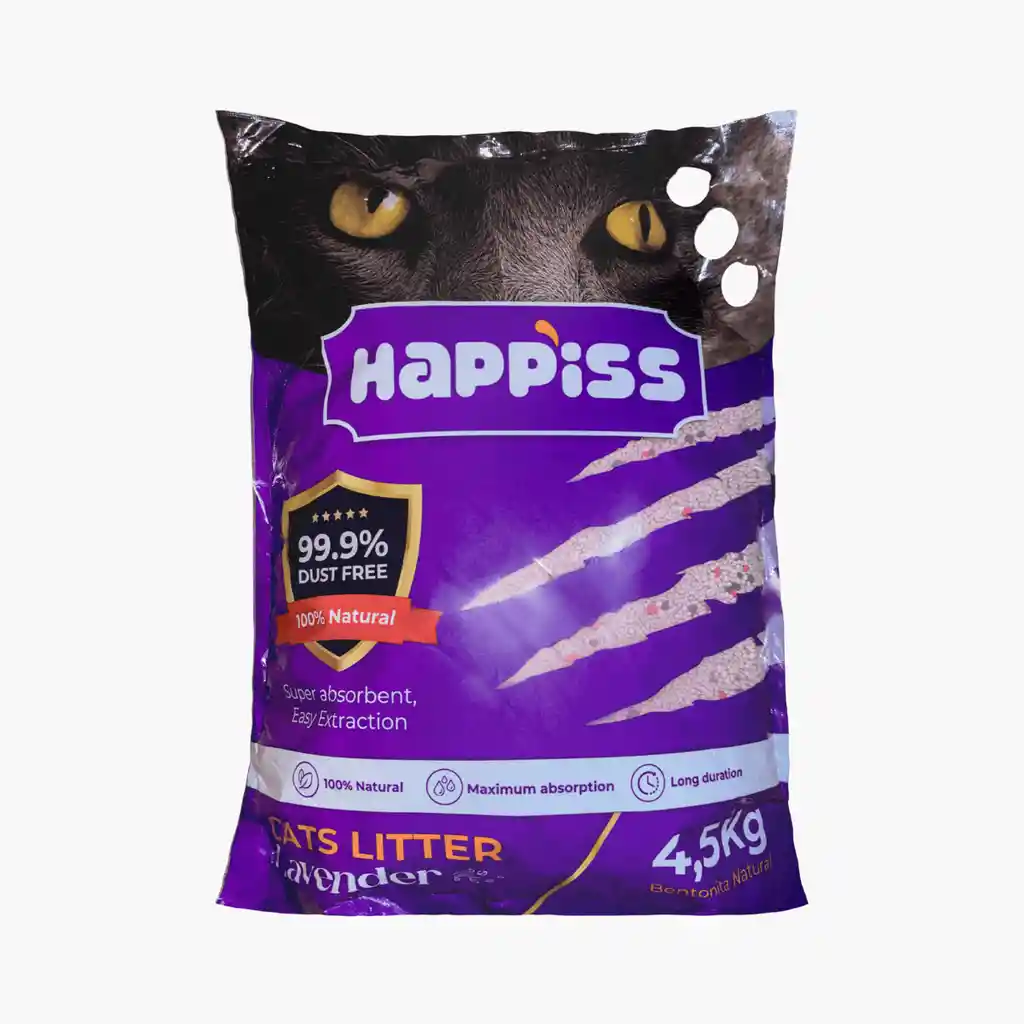 Arena sanitaria para gatos Happiss con bentonita 100% natural y un agradable aroma a lavanda. Happiss garantiz...Ver más