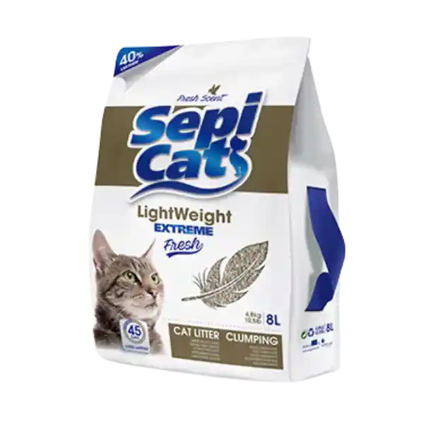 DESCRIPCIÓN: Nuestra última incorporación a la gama de arena aglomerante ligera para gatos: una impresionante eficiencia y un consumo mínimo se dan la mano en nuestra última innovación. Sepicat LightWeight Extreme Fresh está compuesto por micro-gránulos de arcilla superabsorbentes 100% naturales un 40% más ligeros que las bentonitas aglomerantes tradicionales, permitiendo una mayor comodidad en la manipulación y uso del producto.