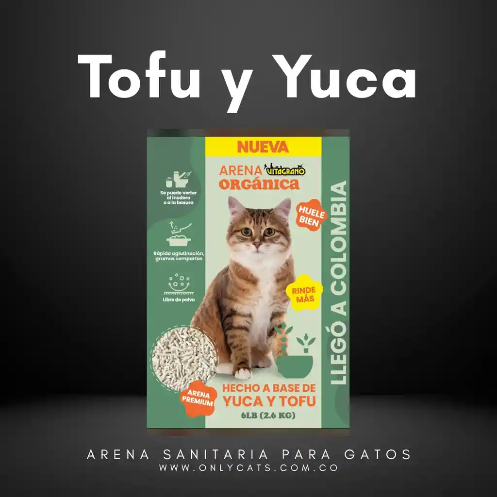 Vitagrano Arena Orgánica está hecha de yuca y tofu: La arena vitagrano cuenta con dos texturas distintas, uno la hace rendidora y dos la yuca en textura de arena ayuda a la aglomeración. ✅ Rinde más ✅ Libre de polvo ✅ Se puede botar al inodoro ✅ Biodegradable ✅No hace tanto reguero 🌿 100% natural y ecológica 📦 Presentación: 6LB (2.6 kg) Recomendamos tener una altura no menor de 4cm de altura, para que tenga una mayor aglomeración.