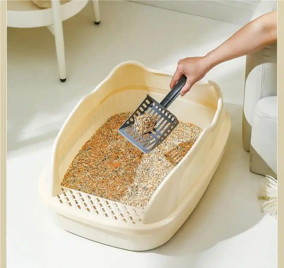 caja de arena para gatos con una pala para recoger desechos. Es un accesorio esencial para la higiene de los gatos domésticos. La imagen muestra a una persona usando una pala de plástico gris para limpiar los desechos de la arena. La arena parece ser de un tipo aglomerante o de pellets, posiblemente hecha de materiales como soya, pino o maíz, dado su color y textura. El diseño de la caja de arena es abierto, con bordes altos para contener la arena y evitar que se esparza.