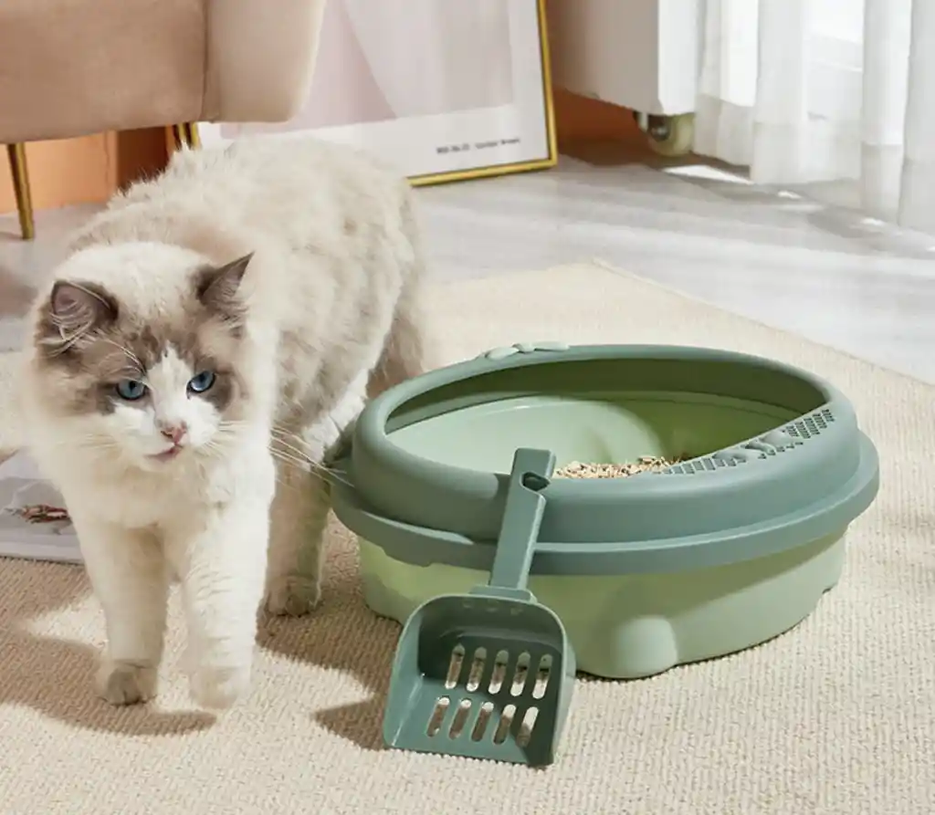 Es un modelo de forma redonda que permite a los gatos hacer sus necesidades de manera cómoda y privada.