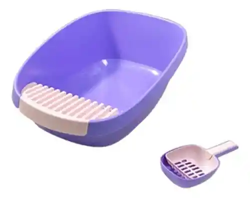arenero, de color morado, con un diseño abierto y una rejilla frontal para ayudar a limpiar las patas del gato al salir. Características: Tipo: Bandeja sanitaria abierta para gatos. Material: Fabricada en polipropileno (PP) de alta calidad, lo que la hace duradera. Diseño: Incorpora una rejilla antideslizante en la entrada para facilitar la limpieza de las patas del gato y evitar que arrastre arena fuera del arenero.