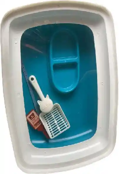 arenera sencilla plástica para gatos en color Turquesa, medidas aproximadas 50cm de largo, 37 cm de ancho, 14 cm de fondo, como obsequio trae un comedero, un recogedor de arena y un collar