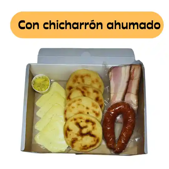 Cuatro arepas de 180 gramos cada una con chicharrón de 250 gramos ahumado para 4 porciones. Viene con 4 tajadas de queso mozarella y mantequilla de ajo