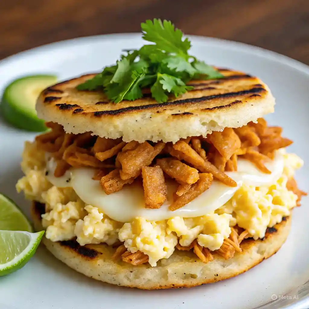 Deliciosa Arepa de Maiz rellena de Chicharron Crujiente, Queso y Pollo en Salsa