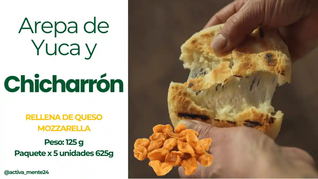 Arepa de Yuca y Chicharron Rellena de Queso Mozzarella Contenido: 5 Unidades x 125 g Peso: 625 gramos. (Alimento congelado)