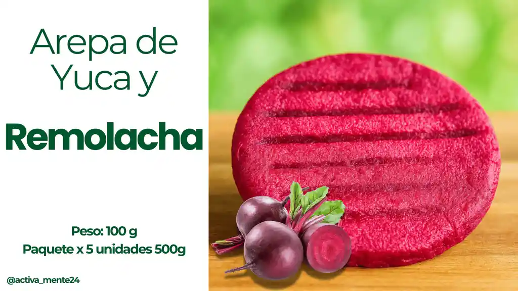 Arepa de Yuca y Remolacha Contenido: 5 Unidades x 100 g Peso: 500 gramos. (Alimento Congelado)