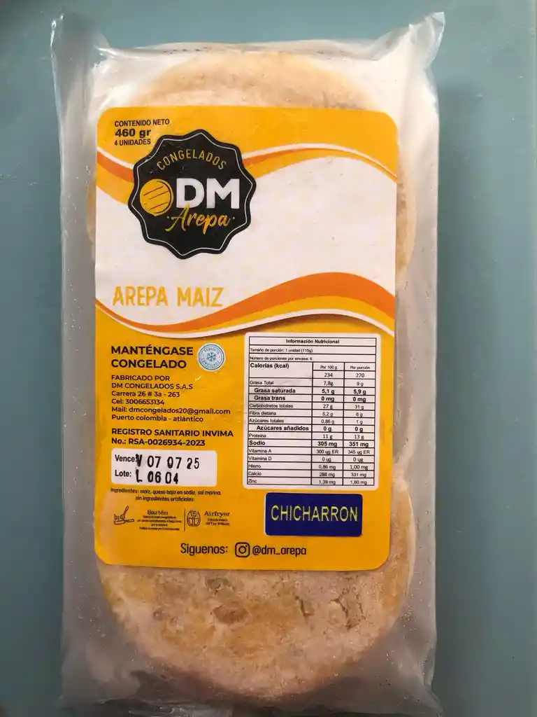 arepa de maiz amarillo con mezcla de chicharon rellena de extra queso x 4und