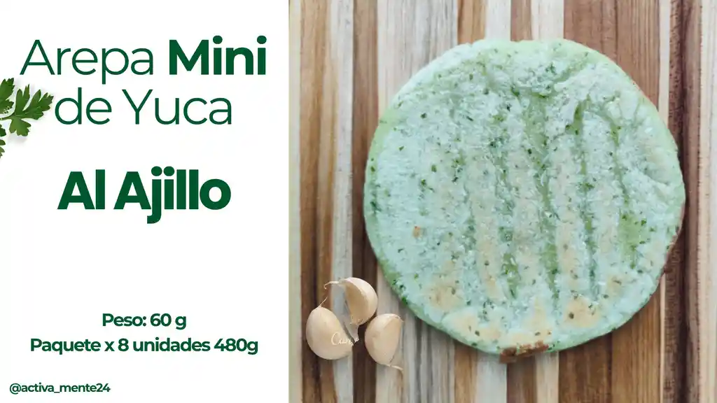 Arepa Mini de Yuca al Ajillo Contenido: 8 Unidades x 60 g Peso: 480 gramos. (Alimento Congelado)
