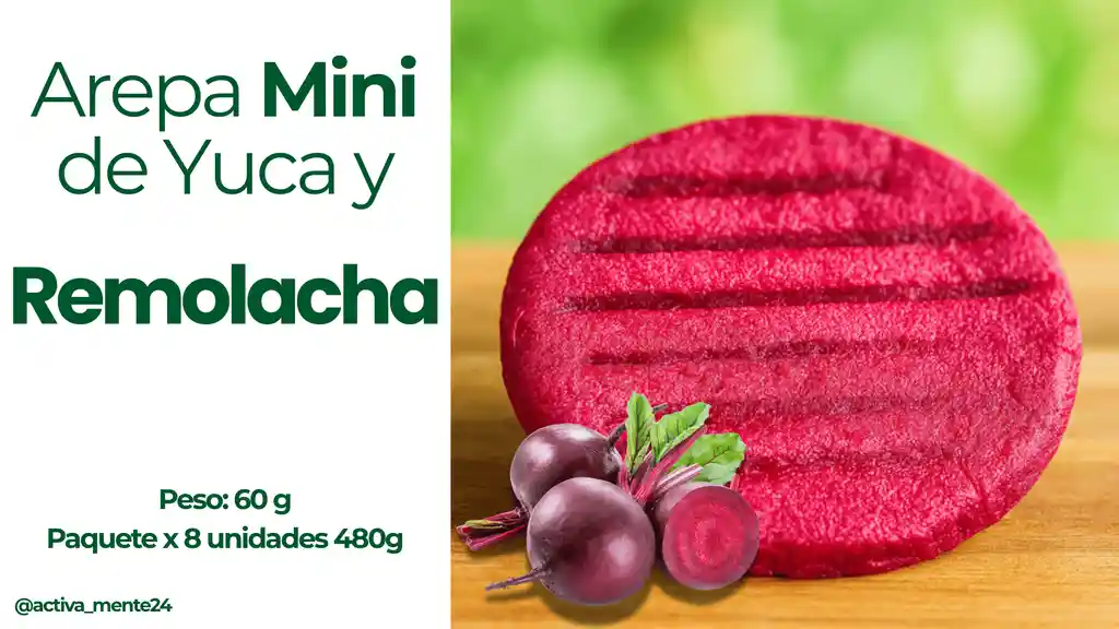 Arepa Mini de Yuca y Remolacha Contenido: 8 Unidades x 60 g Peso: 480 gramos. (Alimento Congelado)