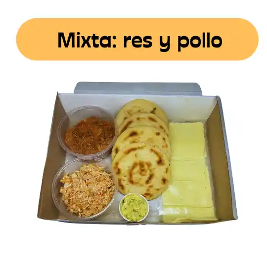 Cuatro deliciosas arepas rellenas de 180 gramos cada una, 4 tajadas de queso mozarella, mantequilla y dos porciones de proteína, una de 200 gramos de carne de res desmechada y la segunda de 200 gramos de pollo desmechado.