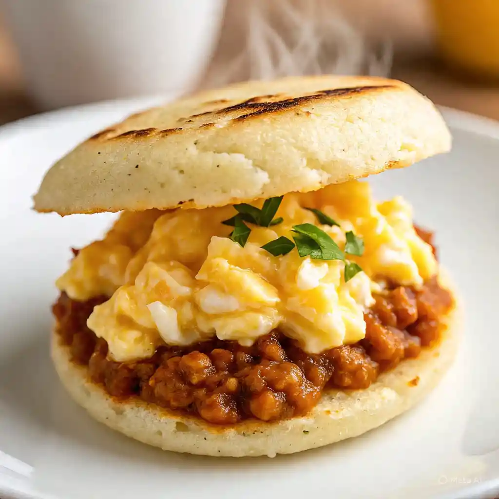 Deliciosa Arepa Rellena de Salsa Criolla Tradicional y Huevo.