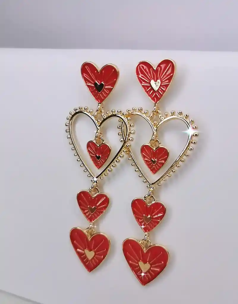 HERMOSO ARETES DE TRES CORAZONES ROJOS, ELABORADOS EN ORO GOLFIELD, PERFECTO PARA COMBINAR TU OUTFIT, LUCIRÁS HERMOSA, ÚNICA Y A LA MODA