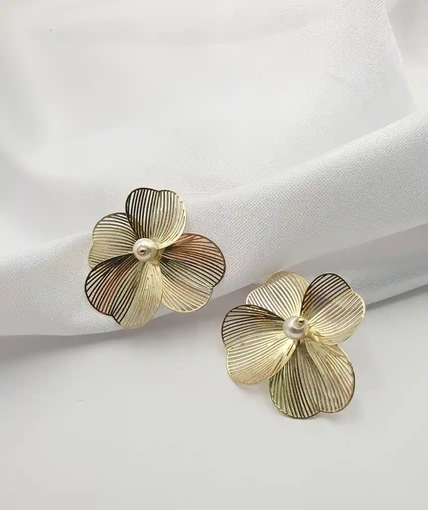 Hermosos Arete de Flor Perla Material: Bronce con baño en Oro de 24kl Tamaño: 3,5 cm de Alto