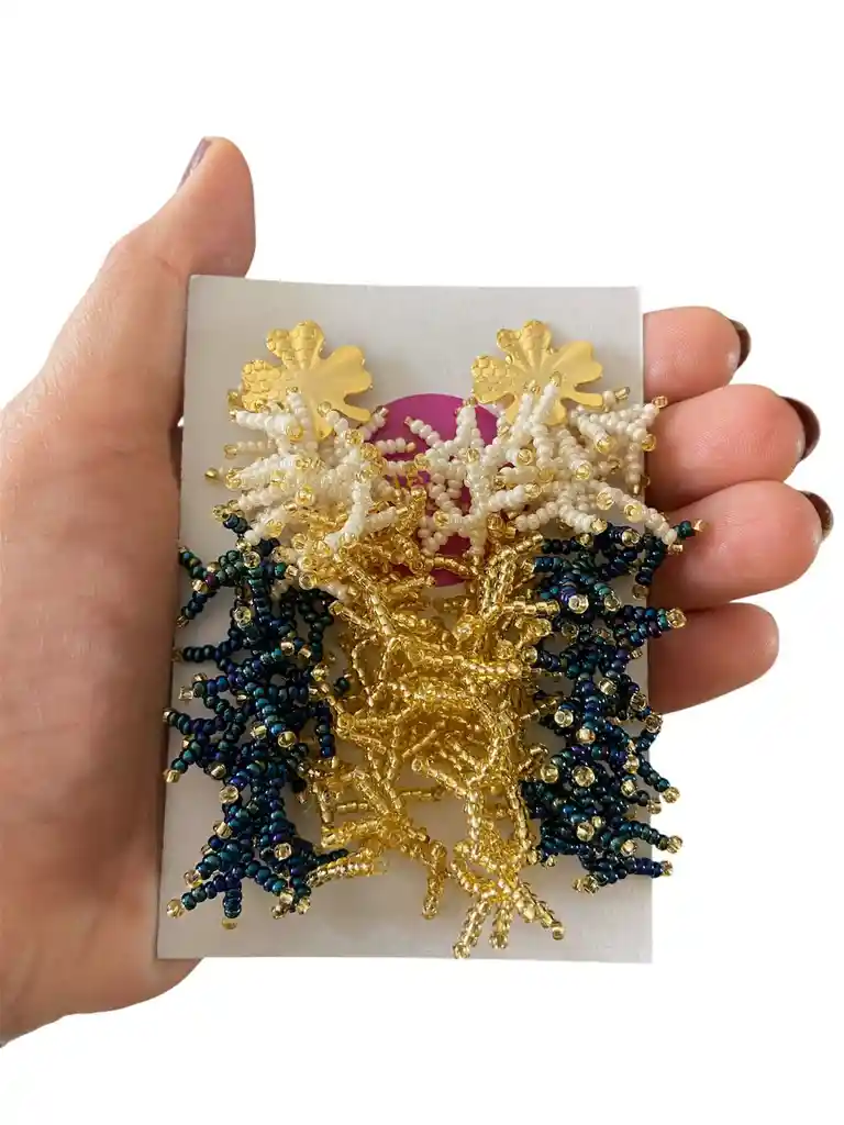 Destaca tu estilo con nuestros aretes artesanales, una obra de arte tejida a mano en mostacilla checa. El diseño tipo coral combina el azul metalizado, habano y dorado para un look sofisticado y único. El toque final de lujo lo da el topo de bronce con baño de oro de 24k, garantizando calidad y brillo. Estos aretes no son solo un accesorio, son una declaración de elegancia. ¡Luce una pieza exclusiva y deslumbra! Material Topo: Bronce con baño en Oro de 24 Kl Arete: Mostacilla checa Largo: 8 cm