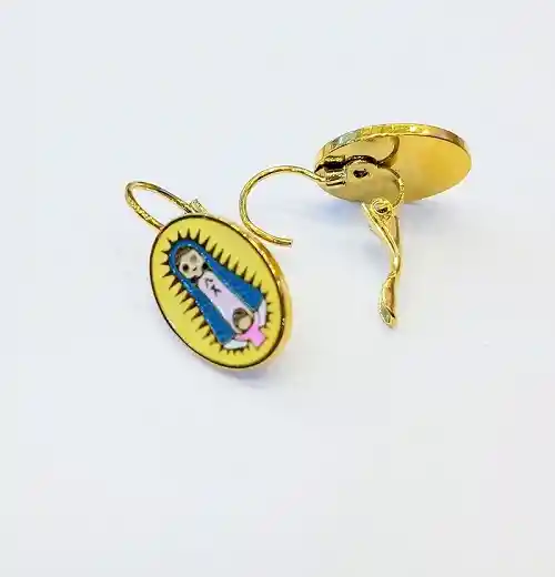 ARETE TIPO GANCHO ARETE ESMALATADO EN ACERO QUIRURGICO HIPOALERGENICO DORADO CON LA MEDALLA DE LA VIRGEN MARIA EN AUREOLA AMARILLA IDELA PARA NIÑAS DETALLE EN FULL COLOR