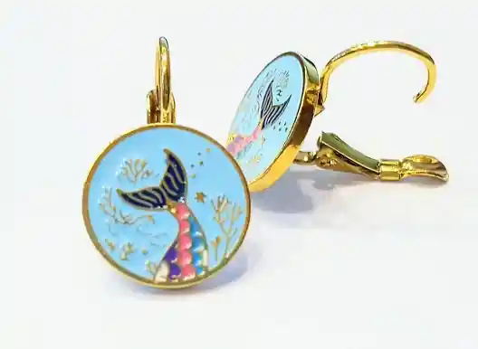 ARETE ESMALTADO EN ACERO QUIRURGICO HIPOALERGENICO DORADO ARETE MEDALLA REDONDA CON ESCENA DE SIRENA ALTO DETALLE EN FORMA Y DETALLE ALTO CONTRASTE EN COLOR Y DISEÑO IDEAL PARA NIÑA Y JOVEN ADULTA ARETE TIPO GANCHO.