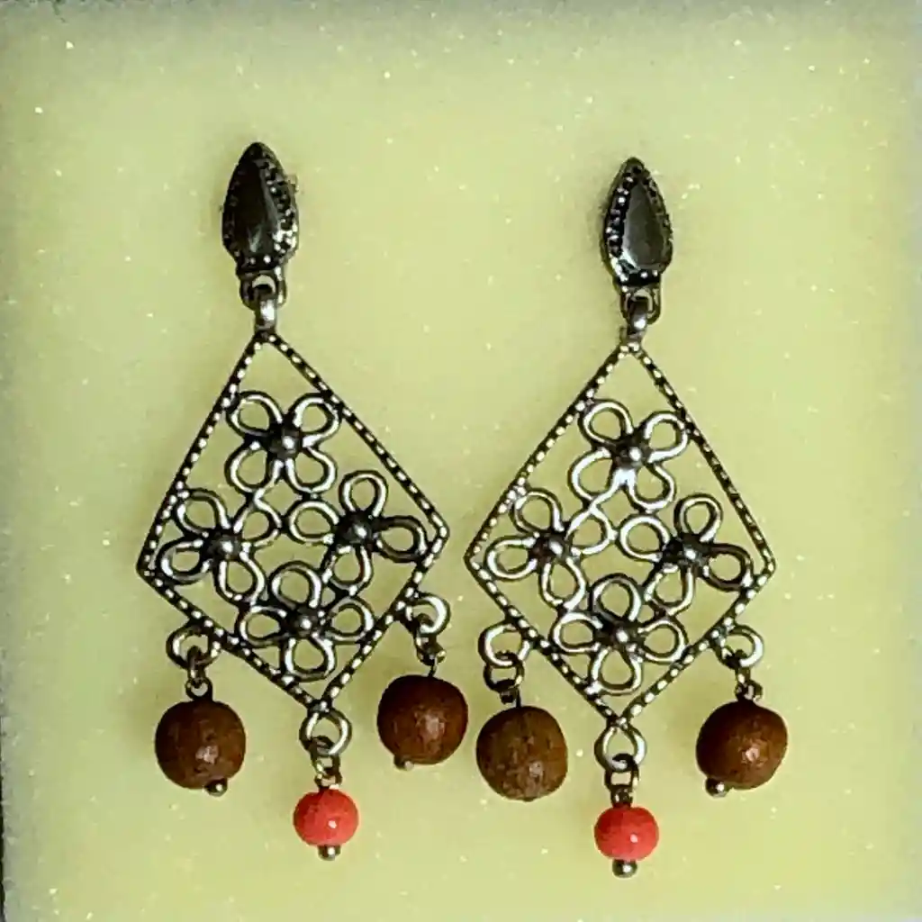 Arete Filigrana Diseñado Exclusivo en Herraje Metal Precioso Plata 925 con aplicaciones de madera y Murano.