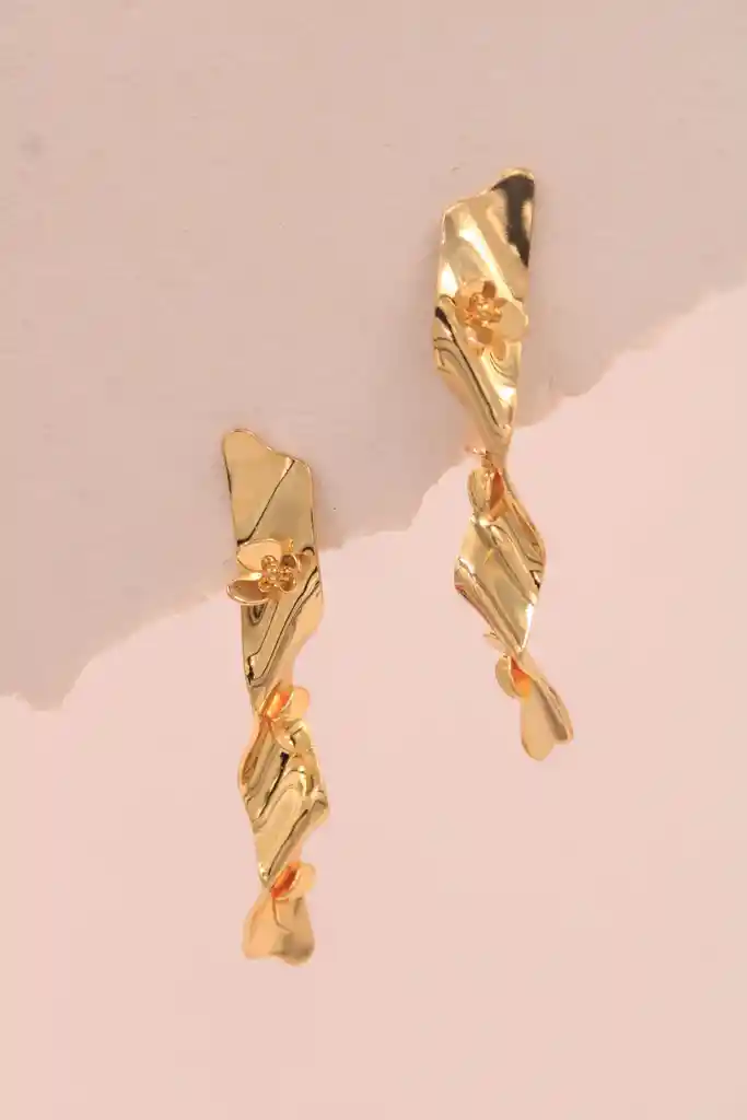 Aretes largos de rodio hipoalergénico con diseño dorado retorcido y mini flores.