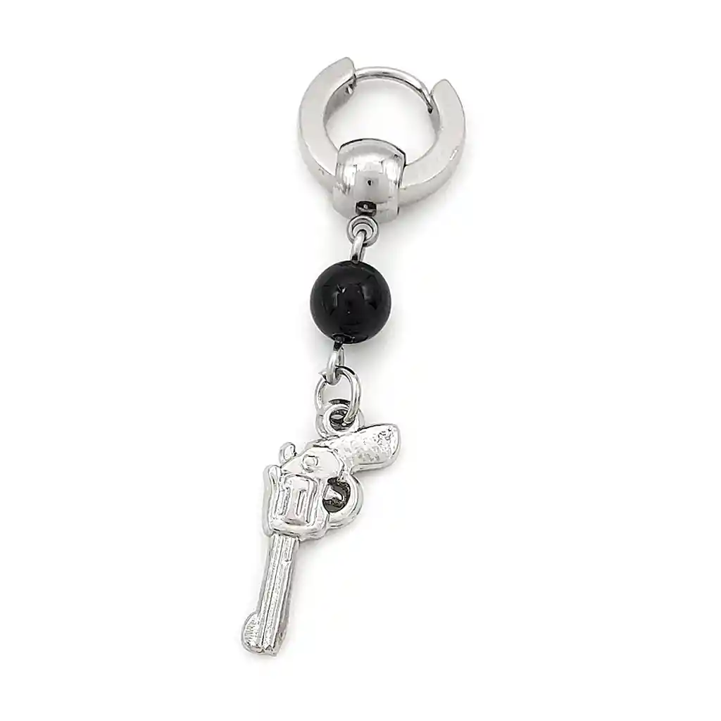 Arete Solitario elaborado con Acero inoxidable, Balin de Piedra Ónix de 6mm y Dije en forma de Revólver Pistola de Acero. Es un accesorio elegante y sofisticado que añadirá un toque único a tu estilo. Cada pieza está cuidadosamente diseñada y elaborada con materiales de alta calidad para garantizar durabilidad y resistencia. Medida: El dije en forma de Revólver mide 1,6 cm de largo por 1 cm de ancho. El arete completo mide 5 cm de extremo a extremo.