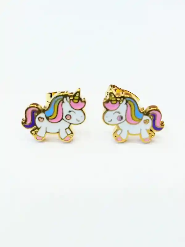 ARETE TOPO MARIPOSA ESMALTADO ARETE EN ACERO QUIRURGICO HIPOALERGENICO DORADO MEDALLA EN FORMA DE PONY UNICORNIO CON CABELLO ARCOIRIS EN ALTO CONTRASTE DE COLOR IDEAL PARA NIÑAS Y JOVEN ADULTO