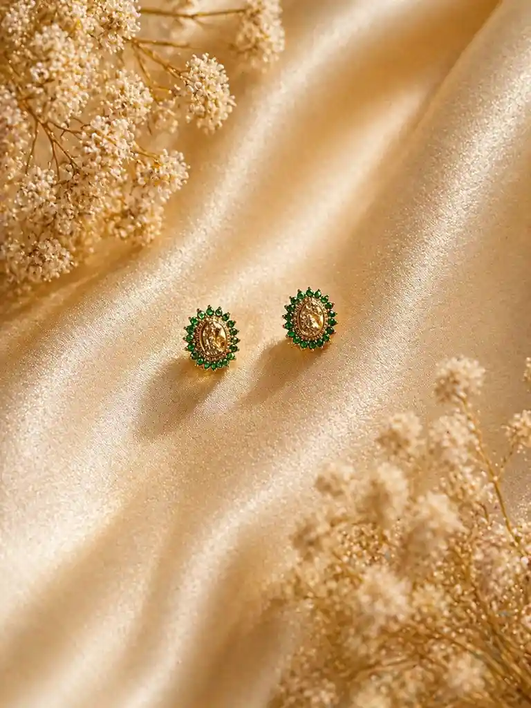 Arete topo virgen milagrosa con circcones verdes en rodio dorado