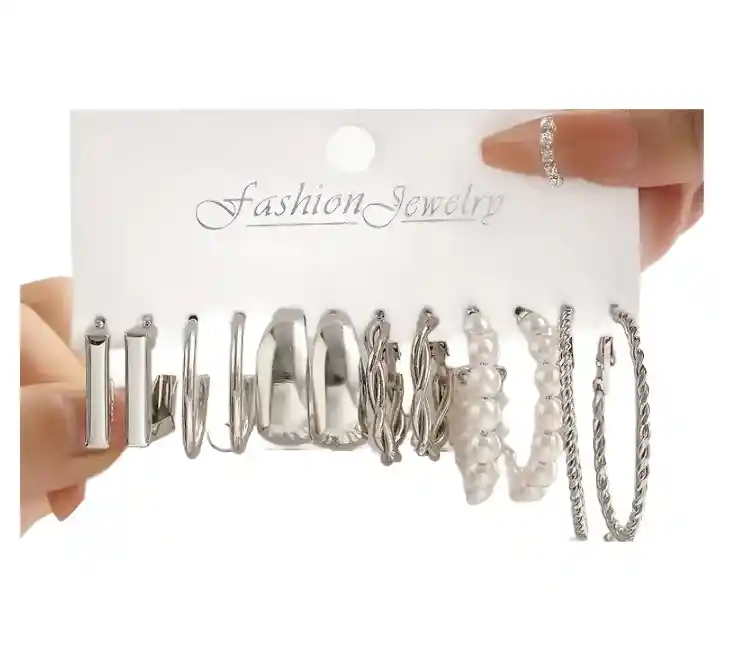 Set de 6 Elegantes Pares de Aretes Plateados de Fashion Jewelry. Este conjunto está diseñado para adaptarse a cualquier ocasión, ya sea un evento casual, una fiesta elegante o un look diario. Cada par de aretes está elaborado en aleación de metales, lo que les confiere un brillo sutil y sofisticado. (plateado modelo 5).