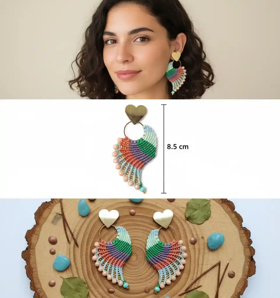 Aretes Alitas Pavo Real · Aura Esmeralda 💚🦚 Déjate envolver por la magia y la elegancia de la naturaleza. Los Aretes Alitas Pavo Real Aura Esmeralda están tejidos a mano con la técnica del micro macramé, combinando armoniosamente verdes pasteles, lila y terracota, colores que evocan calma, espiritualidad y conexión con la tierra. Cada par simboliza belleza, renovación y libertad, inspirado en las alitas del pavo real, un ave asociada con la protección, la abundancia y la confianza interior. Su diseño delicado y artesanal realza tu estilo con un toque único, auténtico y lleno de intención. 🌿 Detalles que enamoran Tejidos en hilo encerado resistente Técnica artesanal de micro macramé Colores suaves y equilibrados: verde pastel, lila y terracota Livianos, cómodos y llenos de personalidad 💫 Ideales para mujeres que aman lo natural, lo hecho a mano y lo exclusivo, estos aretes son perfectos para elevar cualquier look, desde el más sencillo hasta el más especial. Características Aretes alitas, pavo reales, alitas de ángeles, Hecho a mano, en hilo encerado duradero, Topo ensamble en hierro dorado y aro en acero inoxidable, altura del arete 8.5 cm. No son solo aretes, es arte que se lleva puesto. Hazlos tuyos y deja que tu esencia brille con Aura Esmeralda 💚🦚