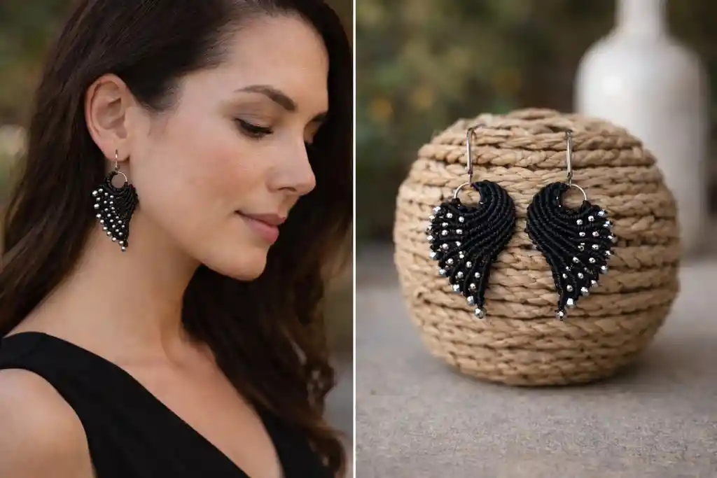 Aretes alitas Sombra Hay piezas que no solo se usan… se sienten. Estas Alitas Sombra están hechas para mujeres que aman lo sutil, lo elegante y lo auténtico 🖤 🖤 Diseño en forma de alas, delicado y orgánico que fluye con cada movimiento 🧵 Tejidas a mano en micro macramé con hilo encerado de alta calidad 🔗 Pendiente tipo catalán con aro en acero inoxidable, ligeros y cómodos 🖤 Detalles en chaquiras y cristales que reflejan la luz con un brillo sofisticado 📏 Altura tejida: 5 cm | Altura total: 6 cm Cada par es único, creado con dedicación artesanal 🖤 No es solo un accesorio… es una expresión de estilo, carácter y conexión con la naturaleza 🌿 📸 Los tonos pueden variar ligeramente según la luz, haciendo que cada pieza tenga su propia esencia ✨ Atrévete a destacar con elegancia natural Hazlas tuyas y deja que tus alas hablen por ti 🖤 🖤 Hechas a mano con amor