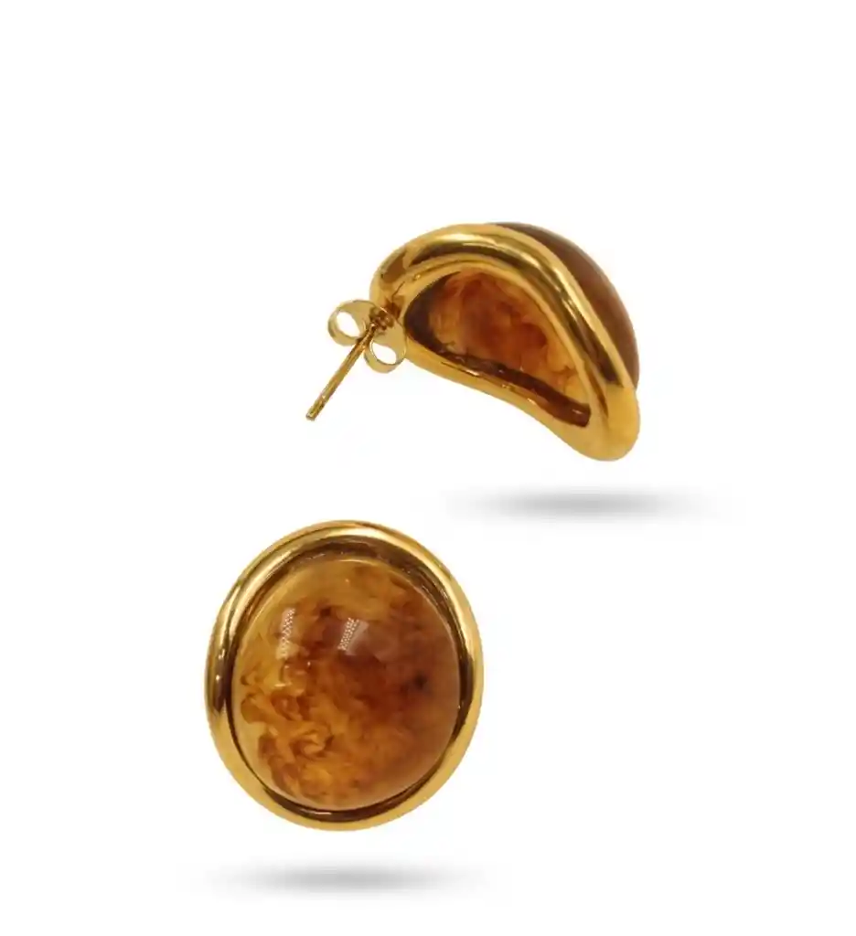 Elegante diseño circular con centro tipo carey y borde en acero inoxidable dorado. Son ligeros, resistentes y perfectos para darle un toque de clase a cualquier outfit.