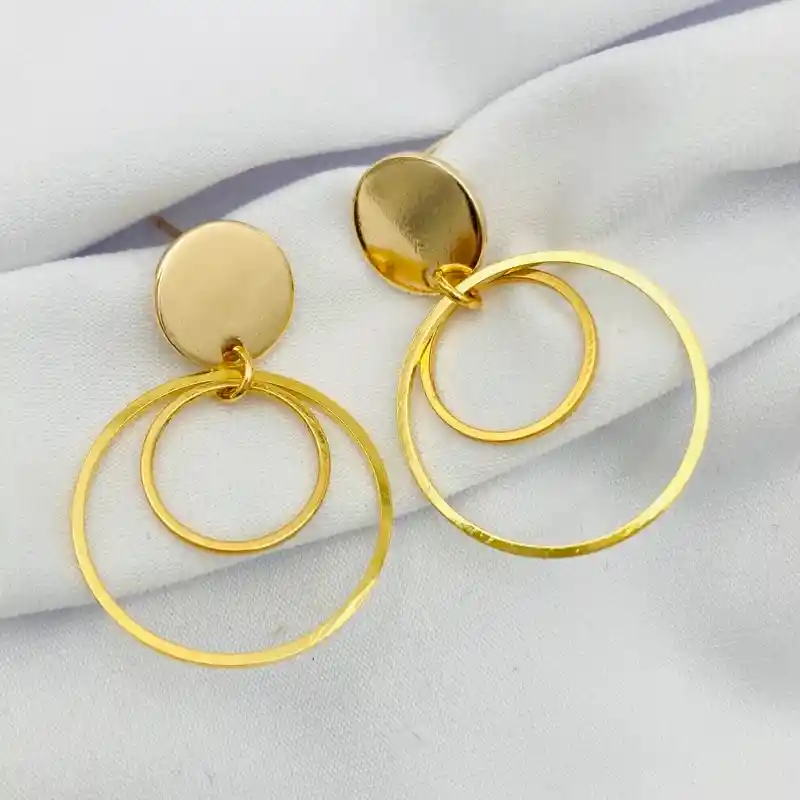 Aretes con argollas doradas pequeñas, son dos argollas y un pin disco liso y brillante. Todo bañado en oro. El largo total de los aretes es de 3cm.