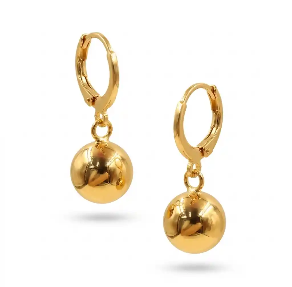 Elegantes aretes de acero inoxidable con dije de esfera dorada y cierre de seguridad. Son livianos, resistentes al agua y perfectos para usar todos los días sin perder el color.