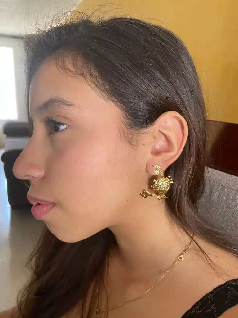Hermosos y delicados Aretes en forma de Cangrejo. Los Cangrejos simbolizan o nos invitan a ser pacientes. Material: Bronce con baño de Oro Medidas: 3,5 cm de alto * 2,5 cm de Ancho