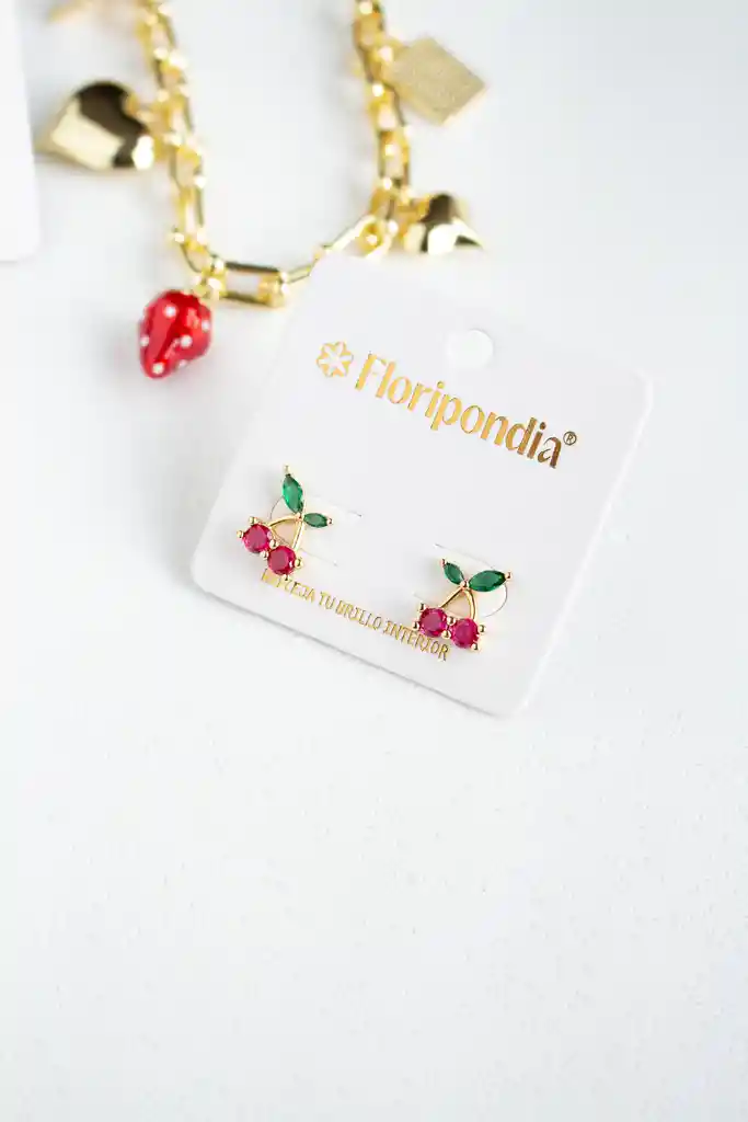Topos elaborados en acero dorado y microcircones. Incluye: 1 par de topos dorados en forma de cereza. Recibe con tu compra una FLORIBAG gratis, para que guardes por separado tus accesorios. *Ten presente que algunas de las imágenes pueden estar ambientadas con otros productos que se venden por separado.