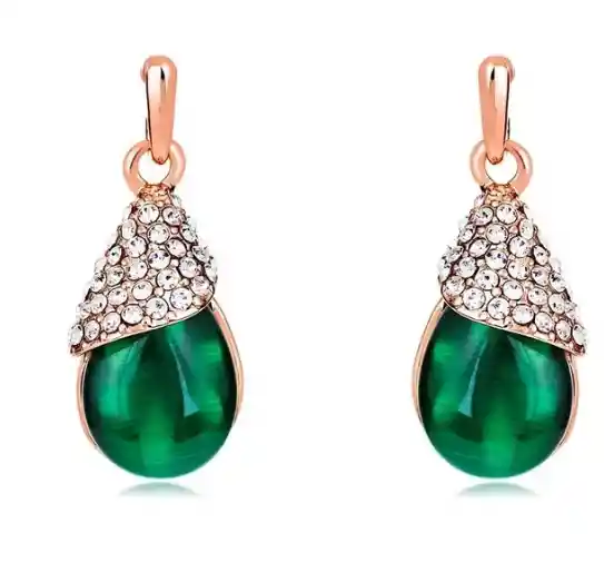 Hermosos Aretes colgantes con baño de oro rosado con incrustación de circones cúbicos e imitación de piedra ópalo color verde. Largo: 2,5 cm..