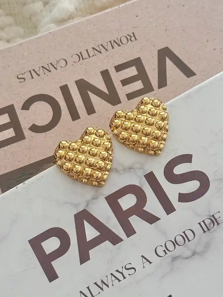 Aretes de topo dorados en forma de corazón, con diseño de círculos en alto relieve.
