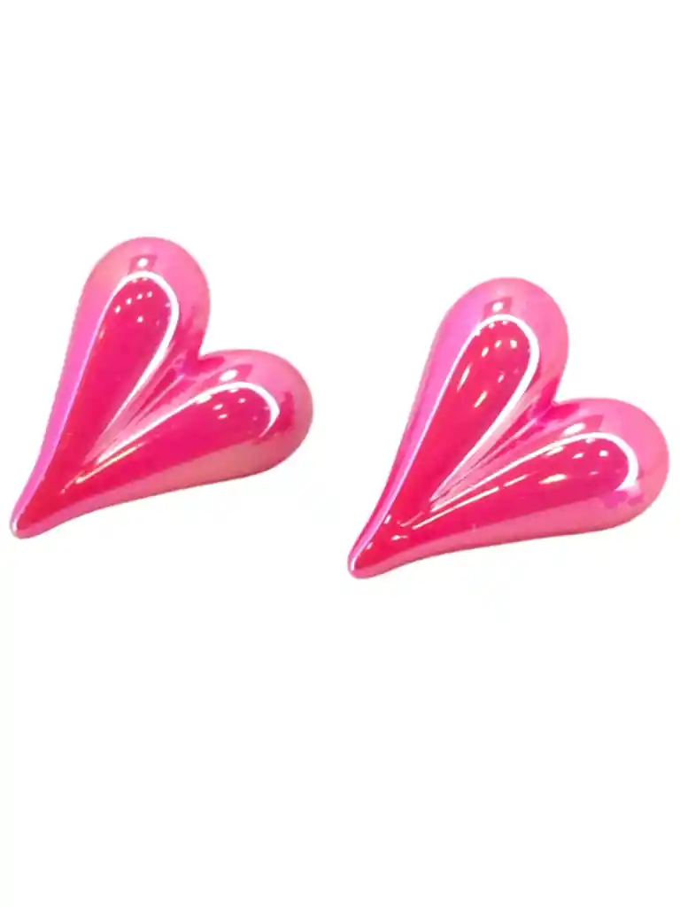 imagínate un par de aretes en forma de corazón, donde la parte superior es más ancha y se estrecha hacia abajo, como un verdadero corazón. Estos aretes están diseñados en un color osado tornasol, lo que significa que tienen un acabado que refleja múltiples colores cuando la luz incide sobre ellos, creando un efecto visual fascinante y cambiante.
