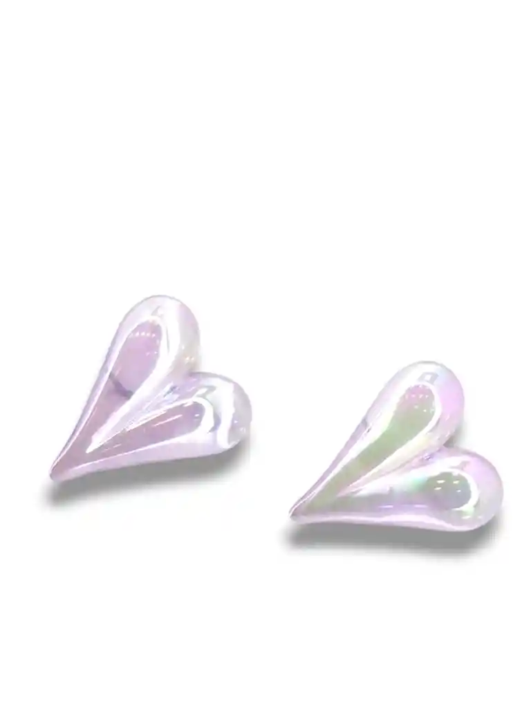 Imagínate un par de aretes en forma de corazón, donde la parte superior es más ancha y se estrecha hacia abajo, como un verdadero corazón. Estos aretes están diseñados en tornasol, lo que significa que tienen un acabado que refleja múltiples colores cuando la luz incide sobre ellos, creando un efecto visual fascinante y cambiante.