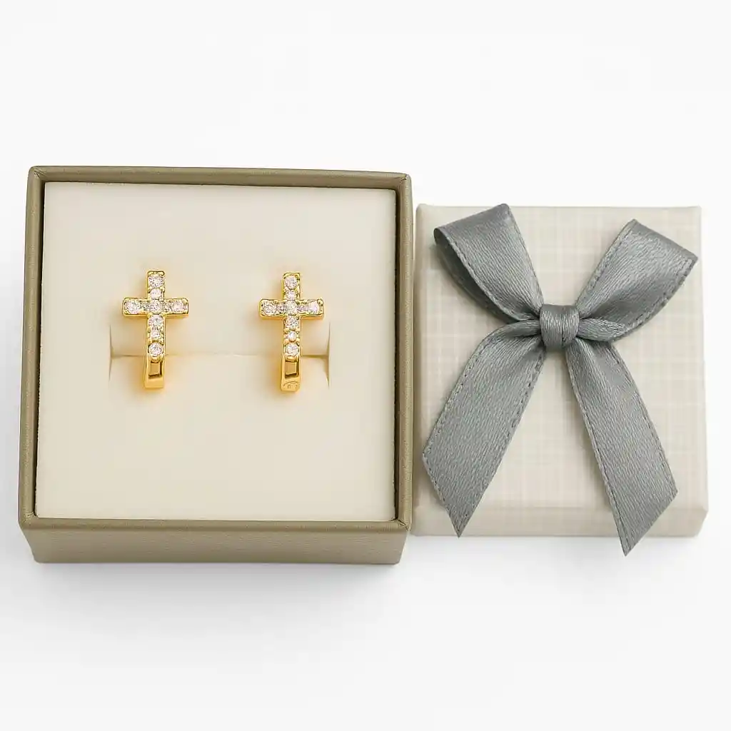 Expresa fe, amor y luz con estos elegantes aretes en forma de cruz. Con cristales brillantes y un fino acabado en acero inoxidable, son el regalo ideal para ocasiones especiales o como símbolo de protección. Presentados en una caja lista para entregar