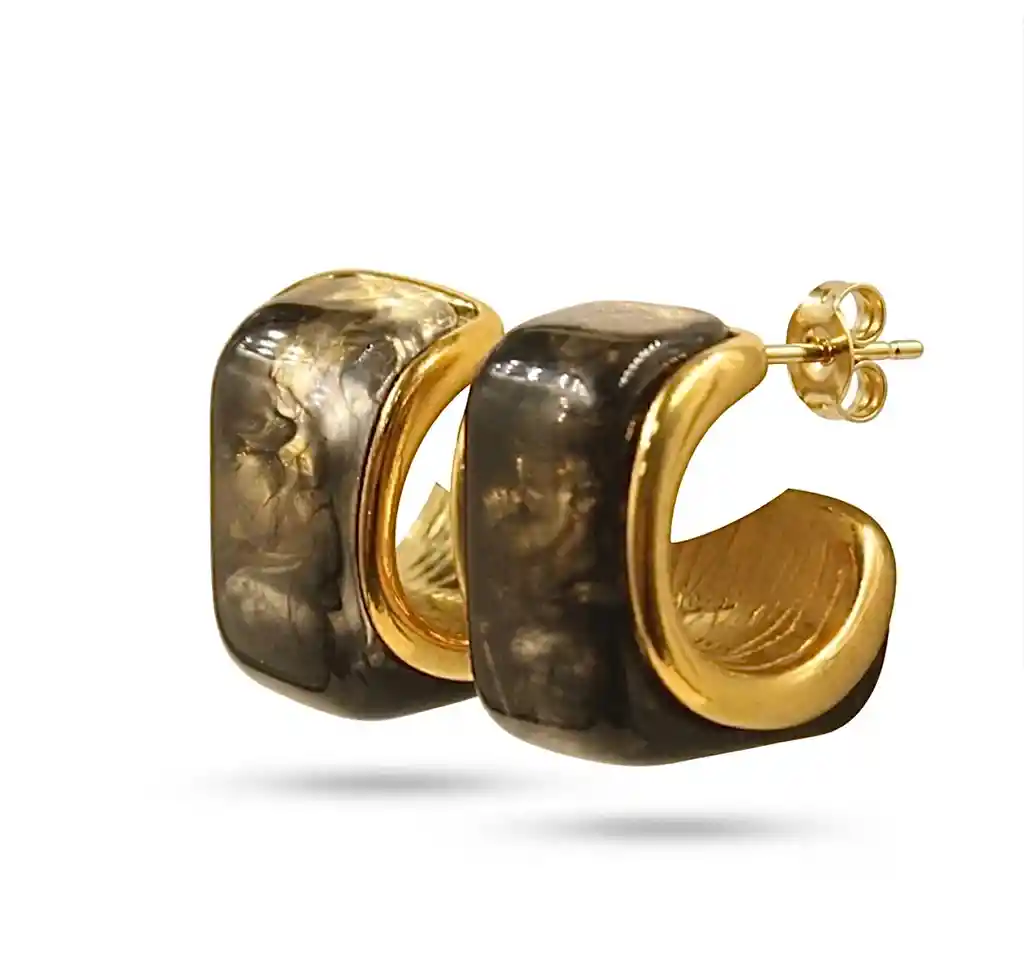 Modernos aretes cuadrados con acabado marmoleado oscuro y bordes de acero inoxidable dorado.