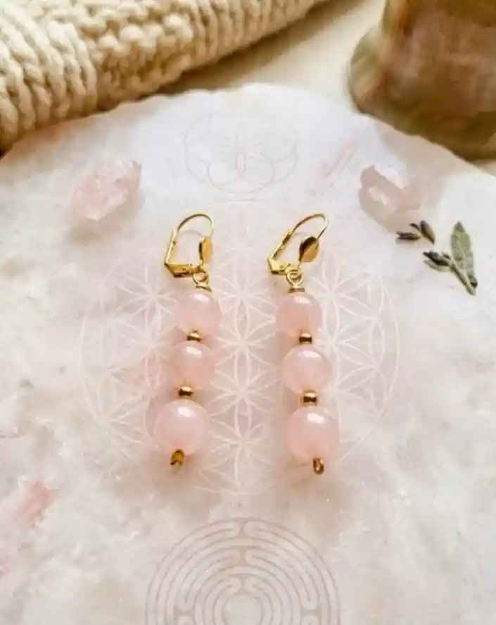Aretes en bronce con baño en oro y 3 piedras cuarzo rosa.piedra del amor incondicional y la paz infinita", simbolizando el amor propio, romántico y la armonía familiar