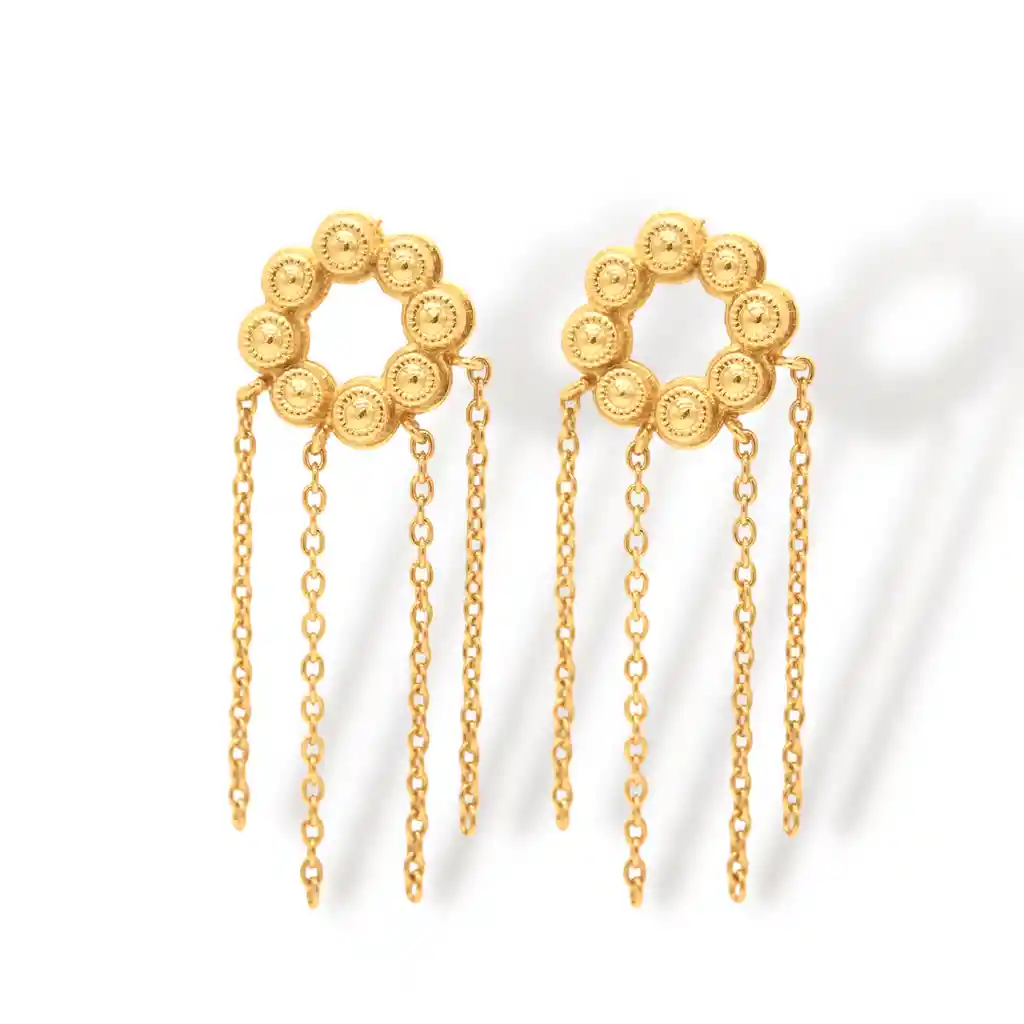 Nuestros aretes con sus cadenas colgantes fueron diseñados pensando en el círculo de la vida, además nos encanta que tenga movimiento mientras caminas. Elaborados en bronce y oro de 24 kilates.