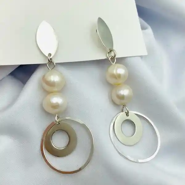 Aretes con figura de plata 925 lisa y brillante, 2 perlas naturales cultivadas de aprox. 8mm. y 2 argollas colgando al final tambien de plata. Los aretes miden 5,8cm de largo en total. Garantía de fabricación. Se entregan empacados para regalo.