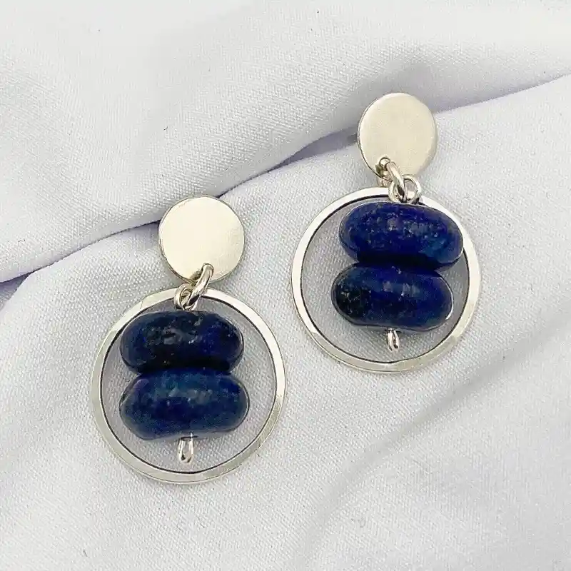 Aretes Caroco, piedra Lapislázuli natural de 1cm, disco y argolla de plata martillada, largo total 2,5cm